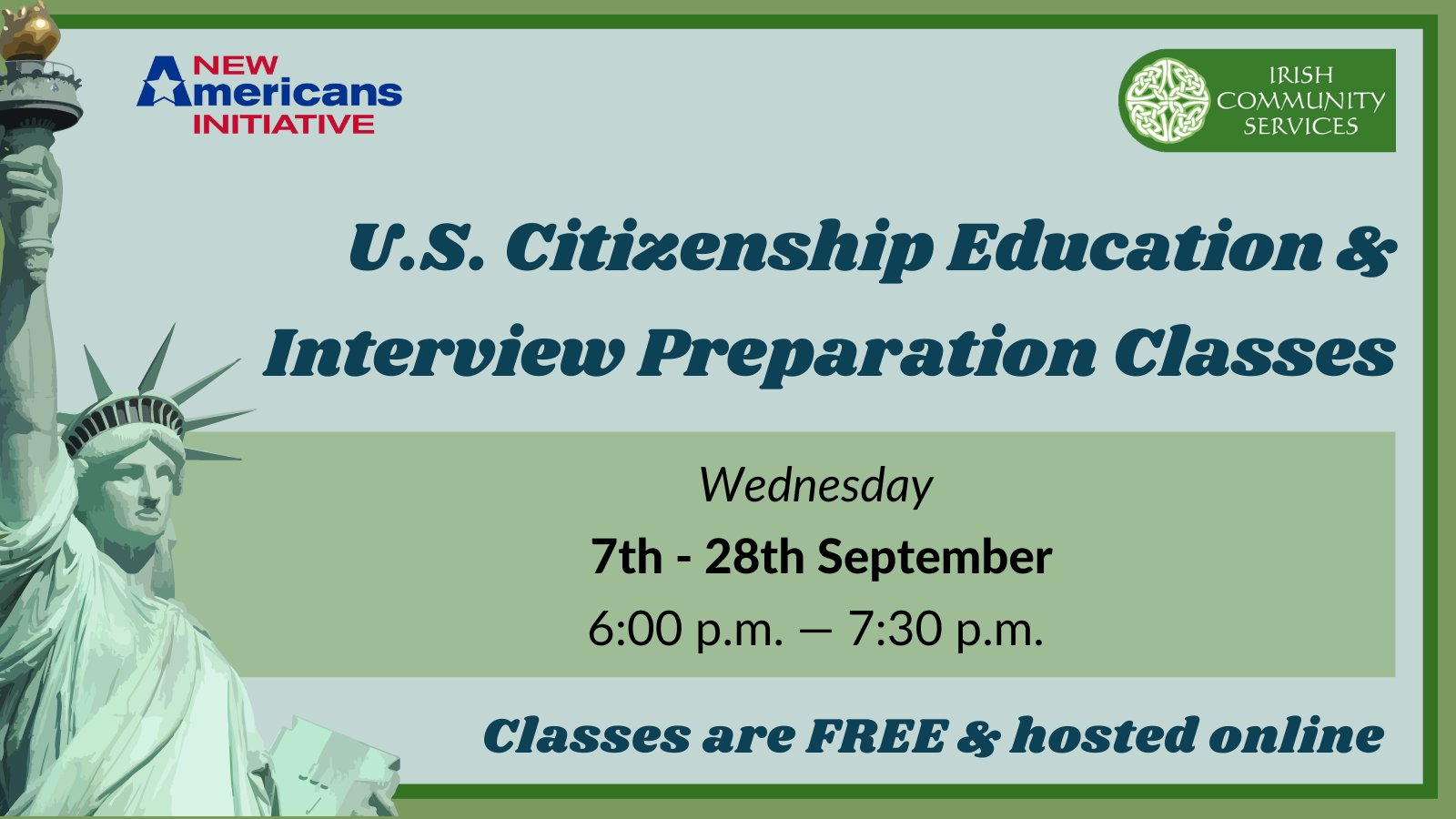 The classes are available Saturdays and weekday. Classes generally meet once or twice a week for 10 - 16 weeks and cover all sections of the Civics History and Government Test including. Are you interested in obtaining your US Citizenship.